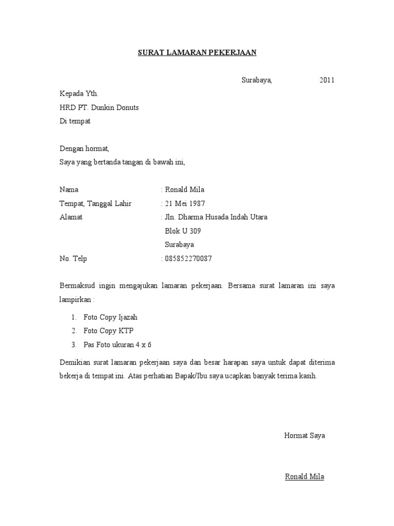 Daftar isi hide contoh surat lamaran kerja terbaru yang baik dan benar contoh surat lamaran kerja umum semua perusahaan Welcome to the dunkin' donuts facebook page! Oleh karena itu, ketika membuat surat lamaran kerja pastikan anda membuat sebaik dan serapi mungkin. Bahwa saat malamar kerja, surat lamaran adalah hal yang sangat penting sebegai penentu dirimu diterima atau tidak sebagai bagian dari. Pada surat ini yang perlu kamu sampaikan adalah alasan ingin bergabung, karakter diri, dan apa yang bisa kamu berikan pada perusahaan.